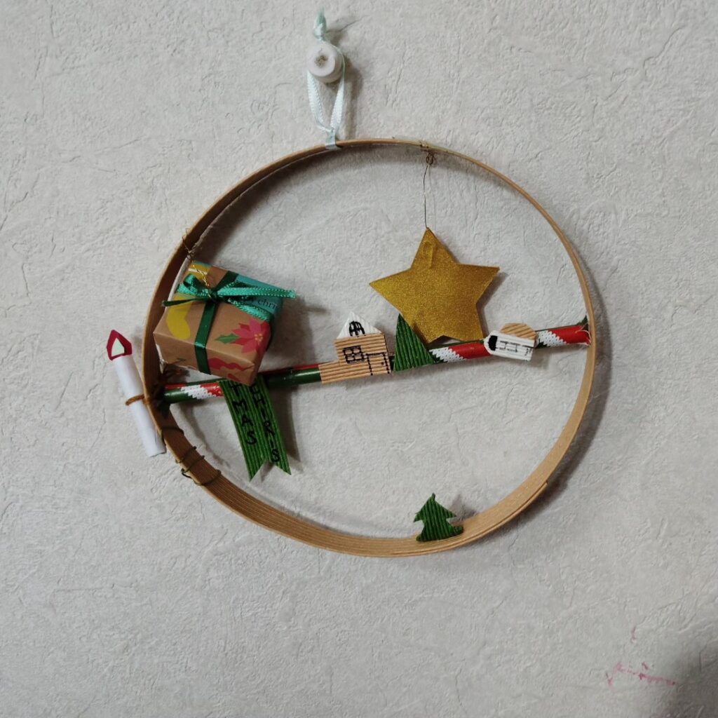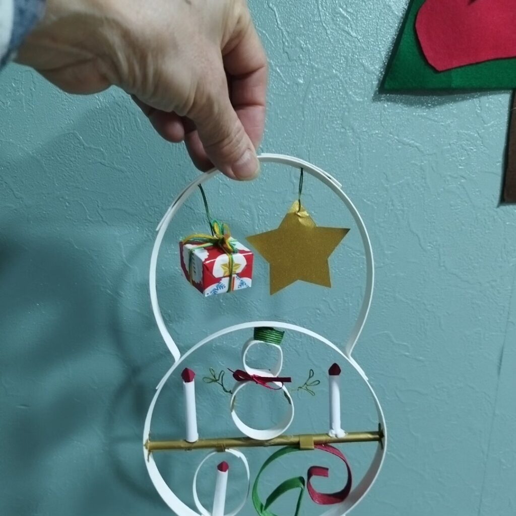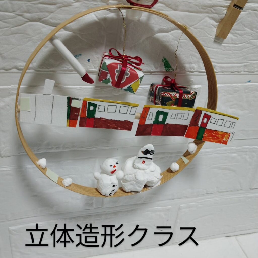 立体造形クラスクラスでは、クラフトバンドを輪にしてその周りに雪だるまやプレゼントを貼ったクリスマスの飾りを作りました!