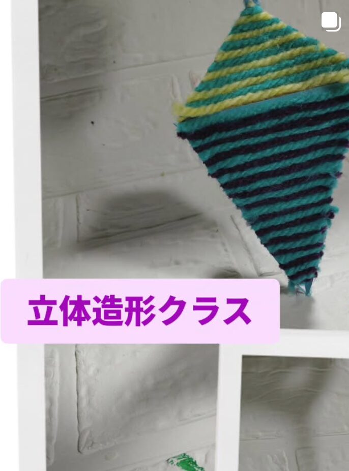 立体造形クラスでは、いつもと趣きを変えてフェルトや毛糸を使いました。一つは毛糸を台紙にシマシマになるように貼り付け、それぞれ切り分け三角を組み合わせたようなミノムシ形に形成します。