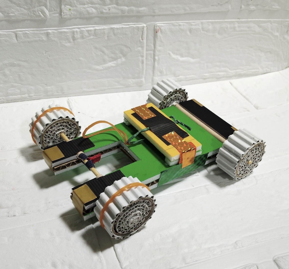 片面段ボールを利用して作ったタイヤのじくに、